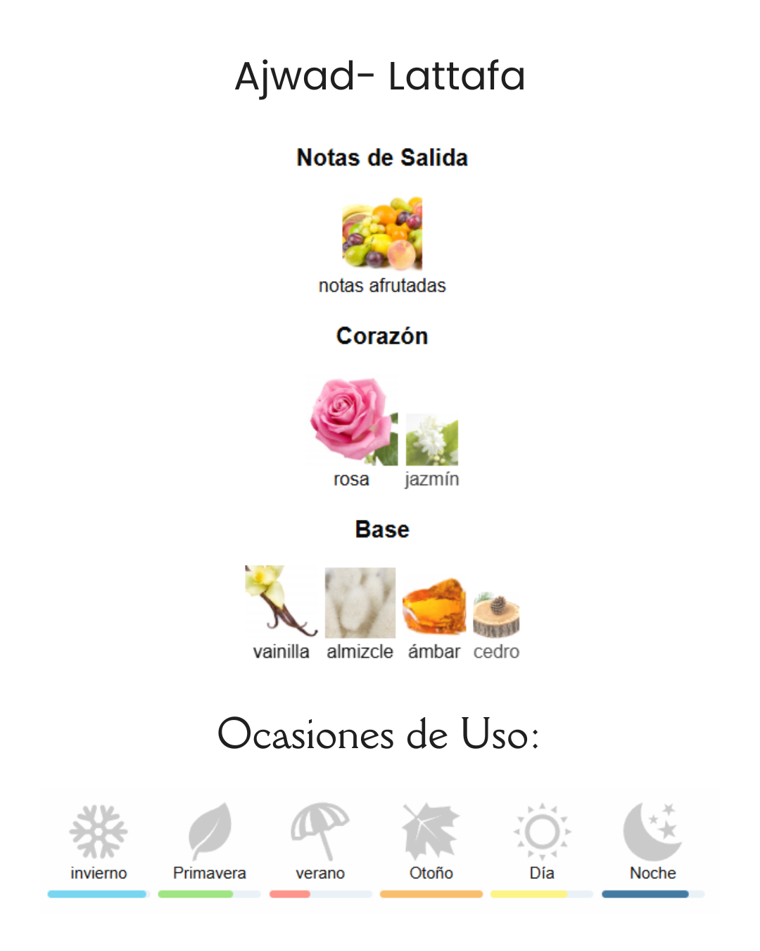 Ajwad de Lattafa Perfumes es una fragancia de la familia olfativa Amaderada Aromática para Hombres y Mujeres. Ajwad se lanzó en 2021. La Nota de Salida es notas afrutadas; las Notas de Corazón son rosa y jazmín; las Notas de Fondo son vainilla, almizcle, ámbar y cedro.