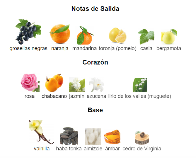 Perfume femenino cítrico, afrutado, avainillado