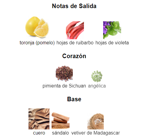 Frescas y excitantes notas superiores a pomelo, hoja de ruibarbo y hoja de violeta egipcia dan paso a las especiadas notas centrales de raíz de angélica y pimienta de Sichuan. El vetiver de Madagascar, sándalo y cuero aportan una base embriagadora y muy adictiva.