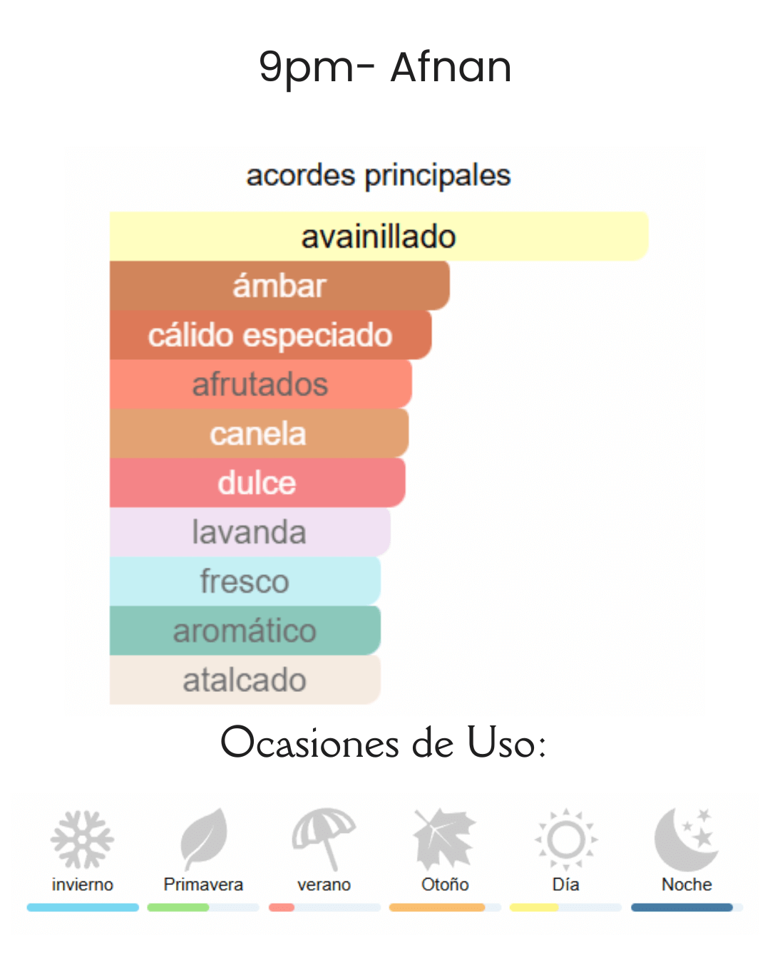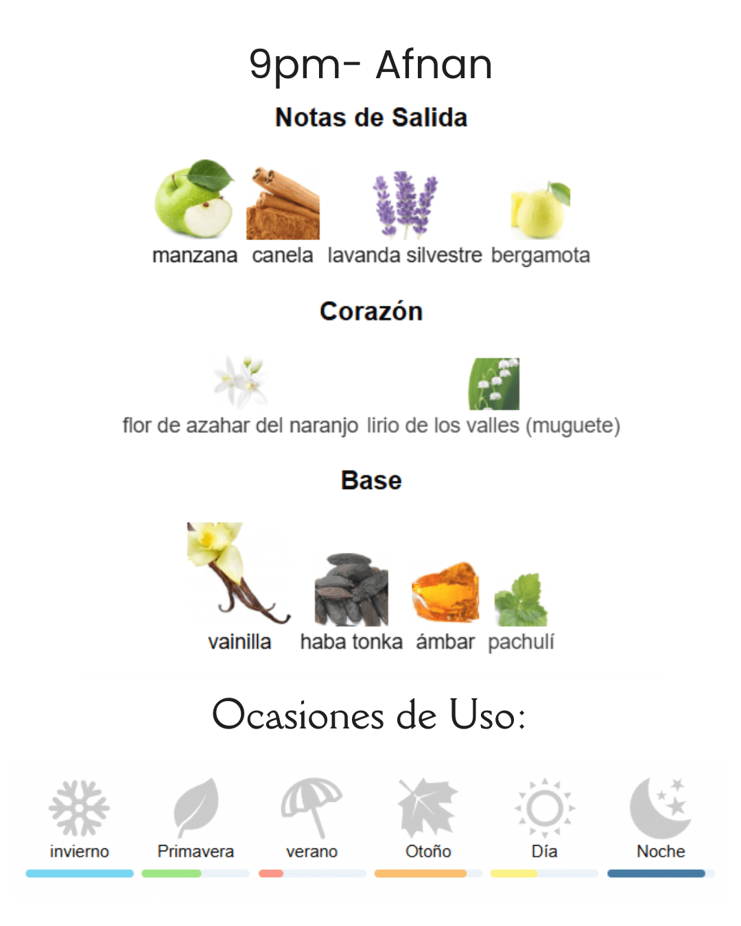 9pm de Afnan es una fragancia de la familia olfativa Oriental Vainilla para Hombres. 9pm se lanzó en 2020. Las Notas de Salida son manzana, canela, lavanda silvestre y bergamota; las Notas de Corazón son flor de azahar del naranjo y lirio de los valles (muguete); las Notas de Fondo son vainilla, haba tonka, ámbar y pachulí.