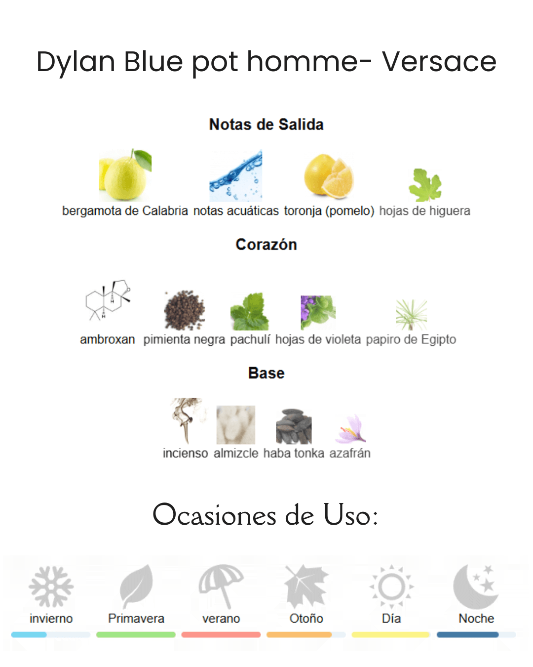 Decant Dylan Blue de Versace es una fragancia de la familia olfativa Aromática Fougère para Hombres. Versace Pour Homme Dylan Blue se lanzó en 2016. La Nariz detrás de esta fragrancia es Alberto Morillas. Las Notas de Salida son bergamota de Calabria, notas acuáticas, toronja (pomelo) y hojas de higuera; las Notas de Corazón son ambroxan, pimienta negra, pachulí, hojas de violeta y papiro de Egipto; las Notas de Fondo son incienso, almizcle, haba tonka y azafrán.