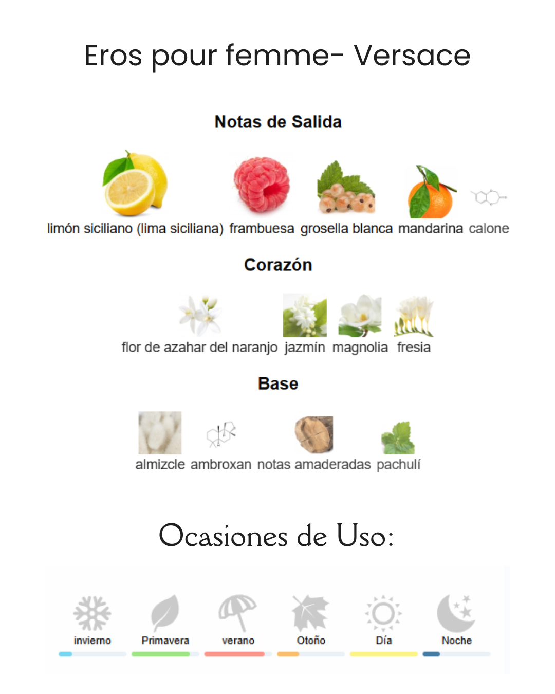 Eros Pour Femme de Versace es una fragancia de la familia olfativa Almizcle Floral Amaderado para Mujeres. Eros Pour Femme se lanzó en 2014. Eros Pour Femme fue creada por Alberto Morillas, Olivier Cresp y Nathalie Lorson. Las Notas de Salida son limón siciliano (lima siciliana), granada y bergamota de Calabria; las Notas de Corazón son flores de azahar del limonero, jazmín sambac (sampaguita), jazmín y peonía; las Notas de Fondo son almizcle, ambroxan, notas amaderadas y sándalo.