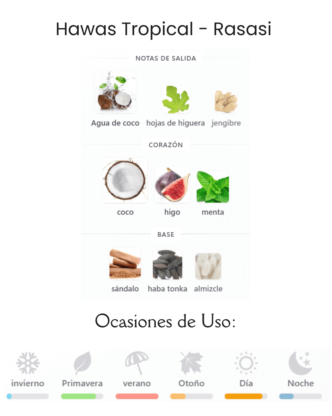Decant Hawas Tropical de Rasasi es una fragancia de la familia olfativa Aromática Verde para Hombres. Esta fragrancia es nueva. Hawas Tropical se lanzó en 2025. Las Notas de Salida son Agua de coco, hojas de higuera y jengibre; las Notas de Corazón son coco, higo y menta; las Notas de Fondo son sándalo, haba tonka y almizcle.