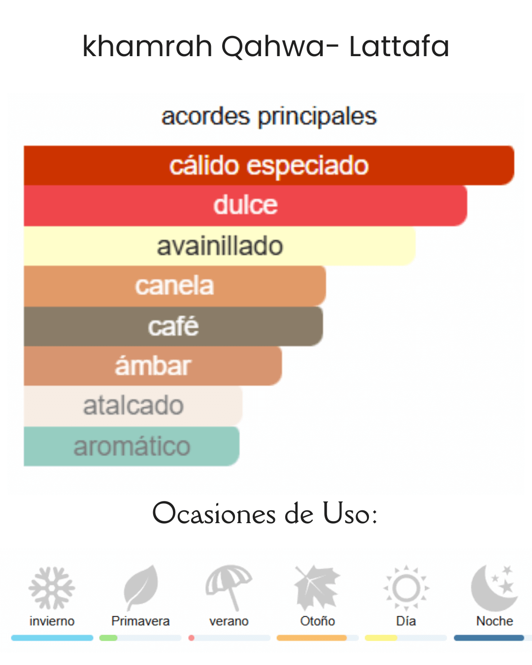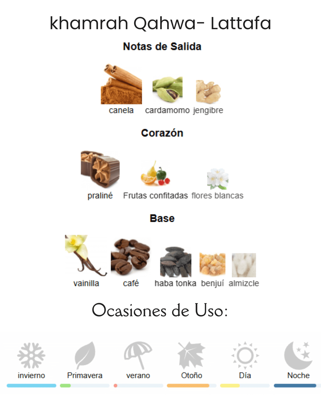 Khamrah Qahwa de Lattafa Perfumes es una fragancia de la familia olfativa Oriental Vainilla para Hombres y Mujeres. Esta fragrancia es nueva. Khamrah Qahwa se lanzó en 2023. Las Notas de Salida son canela, cardamomo y jengibre; las Notas de Corazón son praliné, Frutas confitadas y flores blancas; las Notas de Fondo son vainilla, café, haba tonka, benjuí y almizcle.