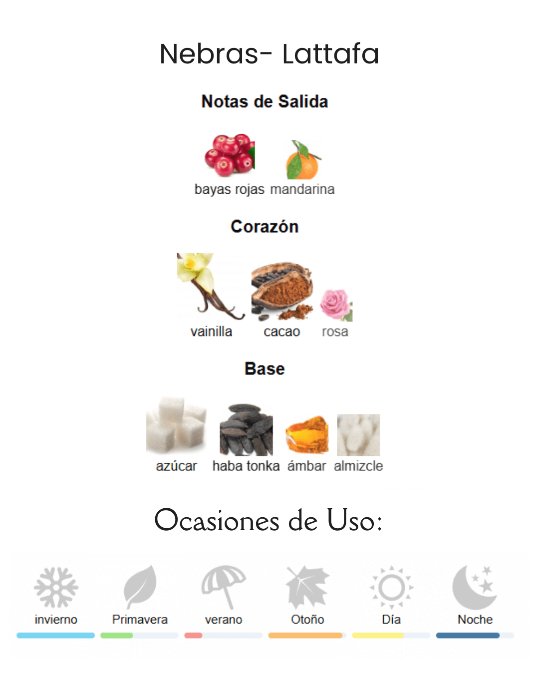 Nebras ofrece una dulzura profunda y sensual con un sutil toque aromático. Esta fragancia llama la atención. Fragancia de la familia olfativa Ámbar Vainilla para Hombres y Mujeres. Esta fragrancia es nueva. Nebras se lanzó en 2022. Las Notas de Salida son bayas rojas y mandarina; las Notas de Corazón son vainilla, cacao y rosa; las Notas de Fondo son azúcar, haba tonka, ámbar y almizcle.