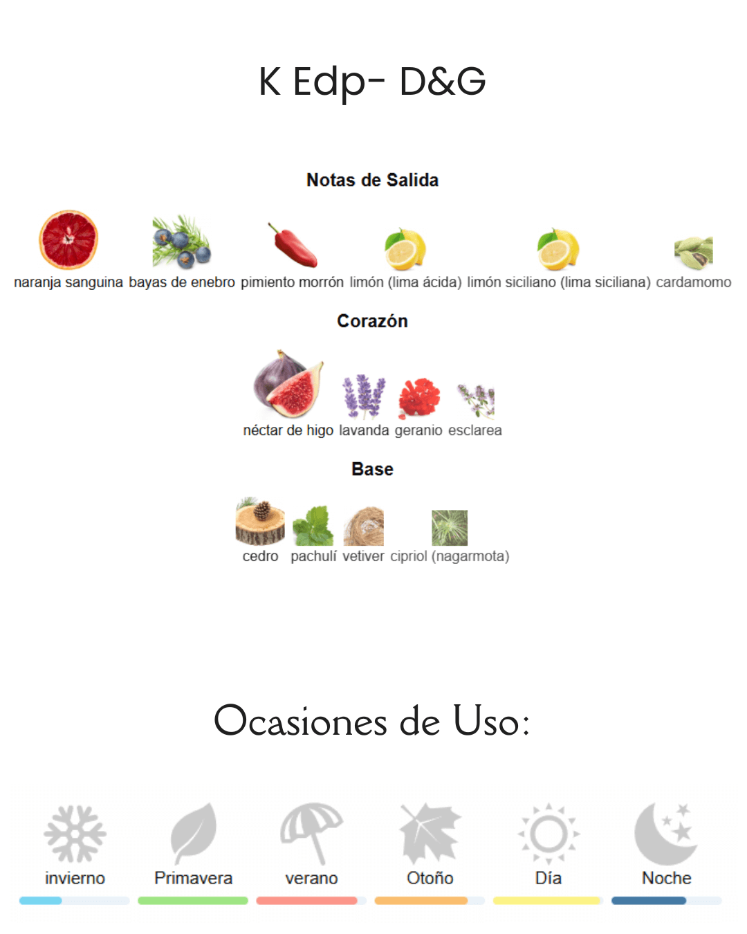 K EDP by Dolce & Gabbana Eau de Parfum de Dolce&Gabbana es una fragancia de la familia olfativa Amaderada Especiada para Hombres. K by Dolce & Gabbana Eau de Parfum se lanzó en 2020. Las Notas de Salida son naranja sanguina, bayas de enebro, pimienta de Jamaica, limón (lima ácida), limón siciliano (lima siciliana) y cardamomo; las Notas de Corazón son néctar de higo, lavanda, geranio y esclarea; las Notas de Fondo son cedro, pachulí, vetiver y cipriol (nagarmota).
